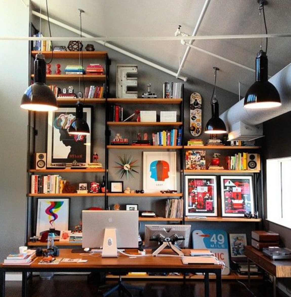 Natural light and a view are two requirements that make a great office. A view can be into the room or out a window. The change in distance is important since most of time we stare at a computer screen which is an arms length away. Having the change in view will exercise the eyes. There are enough studies around the world to demonstrate that we work better near and with natural light. Our energy levels are higher when exposed to natural light and fresh air, and your eyes are less stressed by the end of the day. Desk to chair ratio is important and what height to put the monitor (assuming you're not a luddite). We all have a computer of some form in the house. Paper storage while still slightly old world, it does make life easier when you have to do your taxes rather than sort through all the months of bills you paid online... print them the moment you pay them, then store them. Yes we're still not in a paperless society. Desk lamp. Another item often overlooked item. "Overhead lighting is fine." Hmmm not really. Again its about your eyes and creating a special space with lighting. That "its got something-but-I-don't-know-what" element. Lighting creates ambience as well as illuminating the space. Its a "win win" since you'll like your desk more and ultimately be seated at it longer, getting that much more done for more free time to enjoy life. That is assuming you're not playing video games on the desktop.