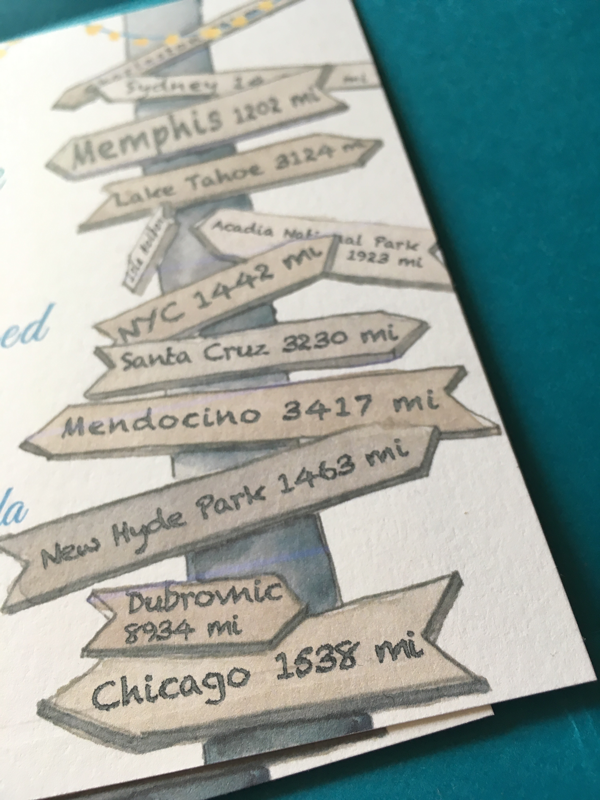 This sign was based on a famous tourist sign in Key West. We redesigned it with their trips while courting; he lived in Tahoe, while she is a born and lived in New Yorker...
